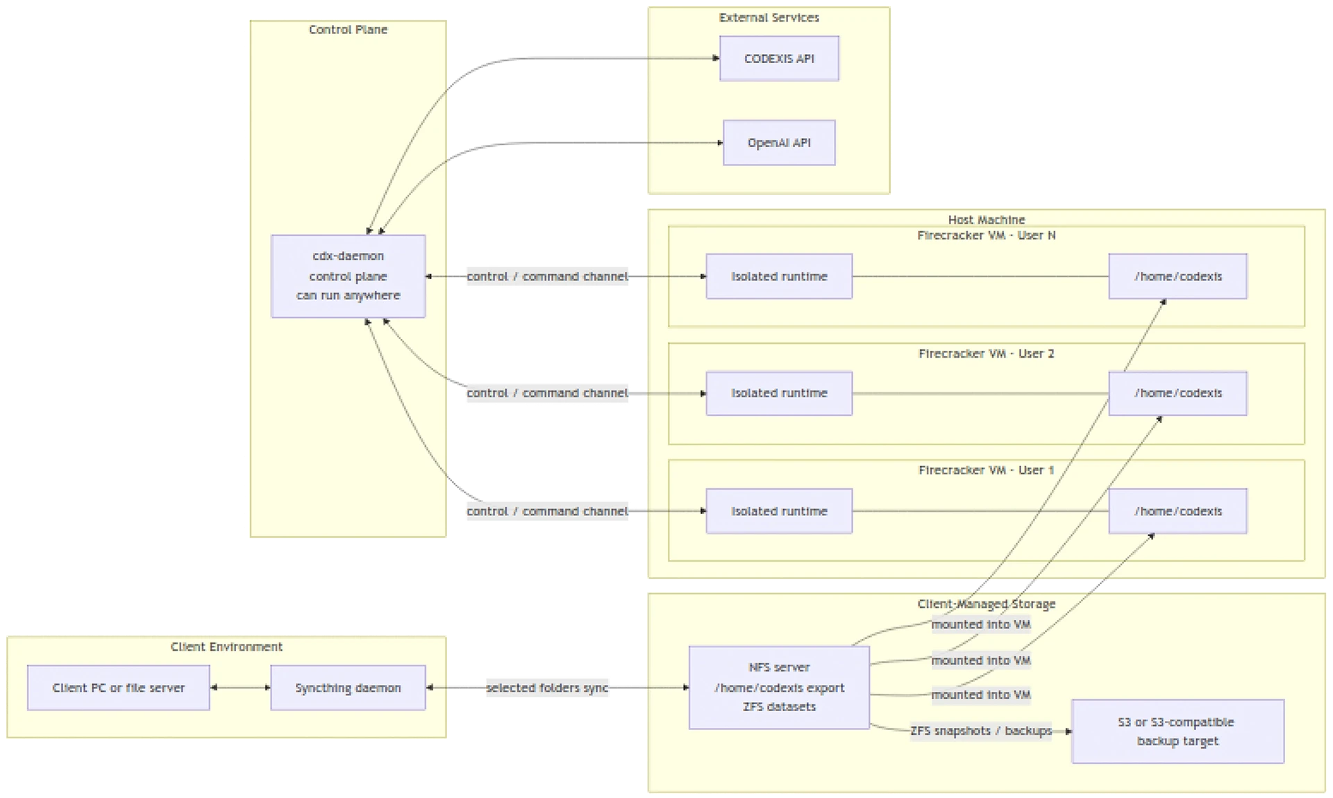 Domovský adresář /home/codexis je do VM připojen z NFS serveru. Úložiště na NFS je spravováno přes ZFS datasety a zálohováno snapshoty do S3 nebo do S3-kompatibilního úložiště. Pokud klient požaduje, aby veškerá obchodní data zůstala lokálně, lze celý tento stack provozovat on-premise a pro zálohy použít lokální S3-kompatibilní objektové úložiště. Externími službami pak zůstávají pouze CODEXIS API a OpenAI API.
